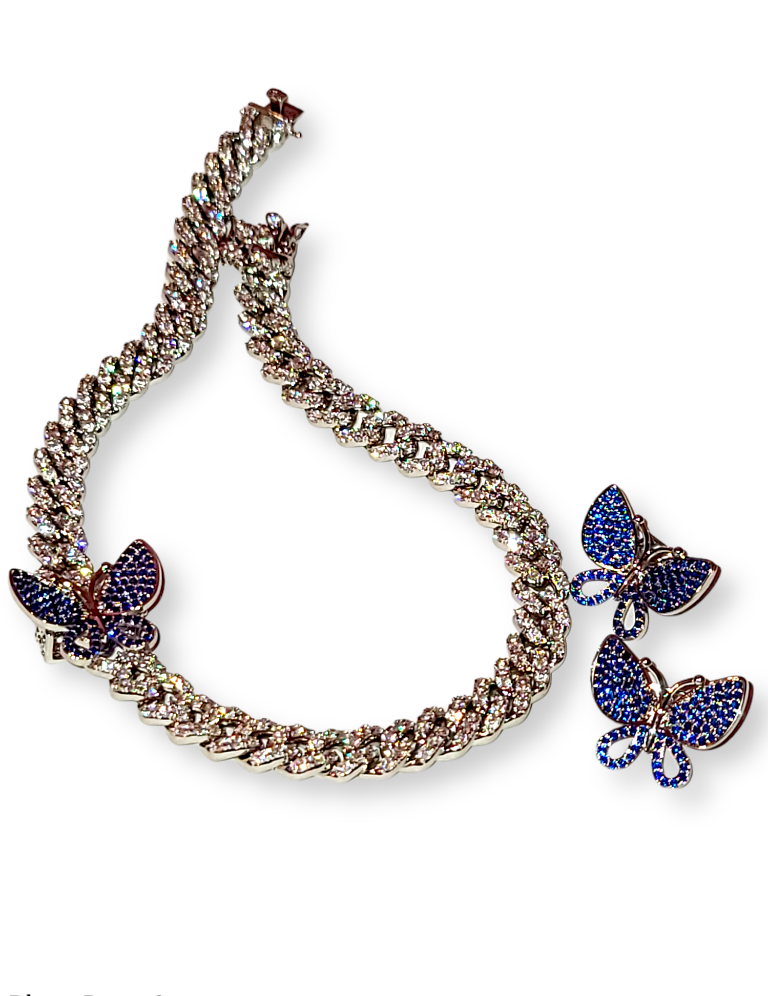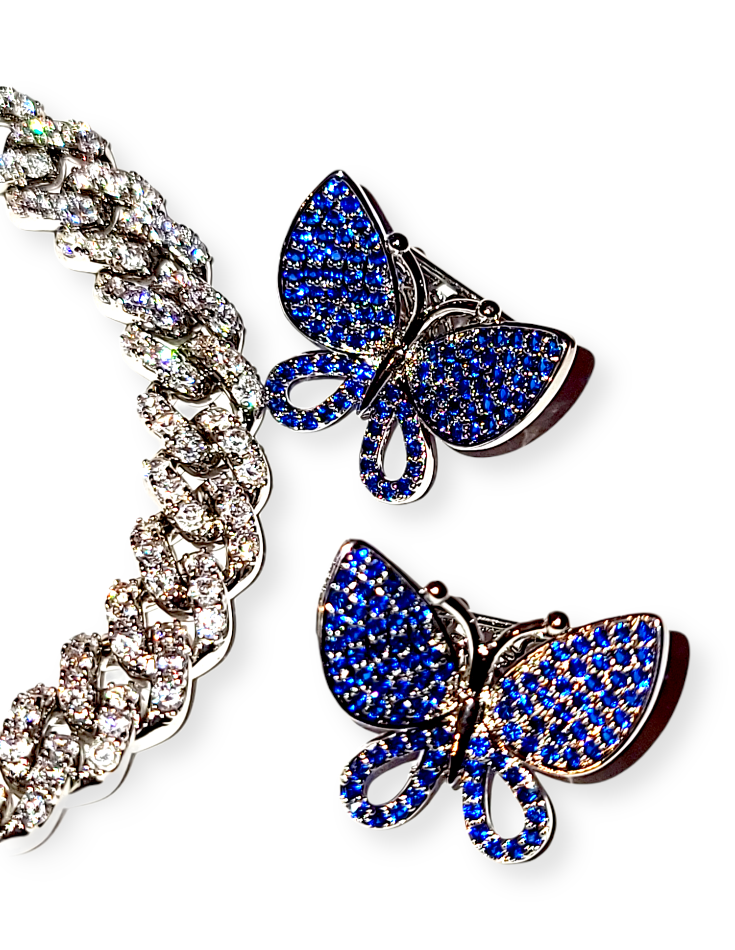 Our Butterfly Blues Cuban links comes in 14 inches choker style. Detachable Butterfly charms in blue stones.