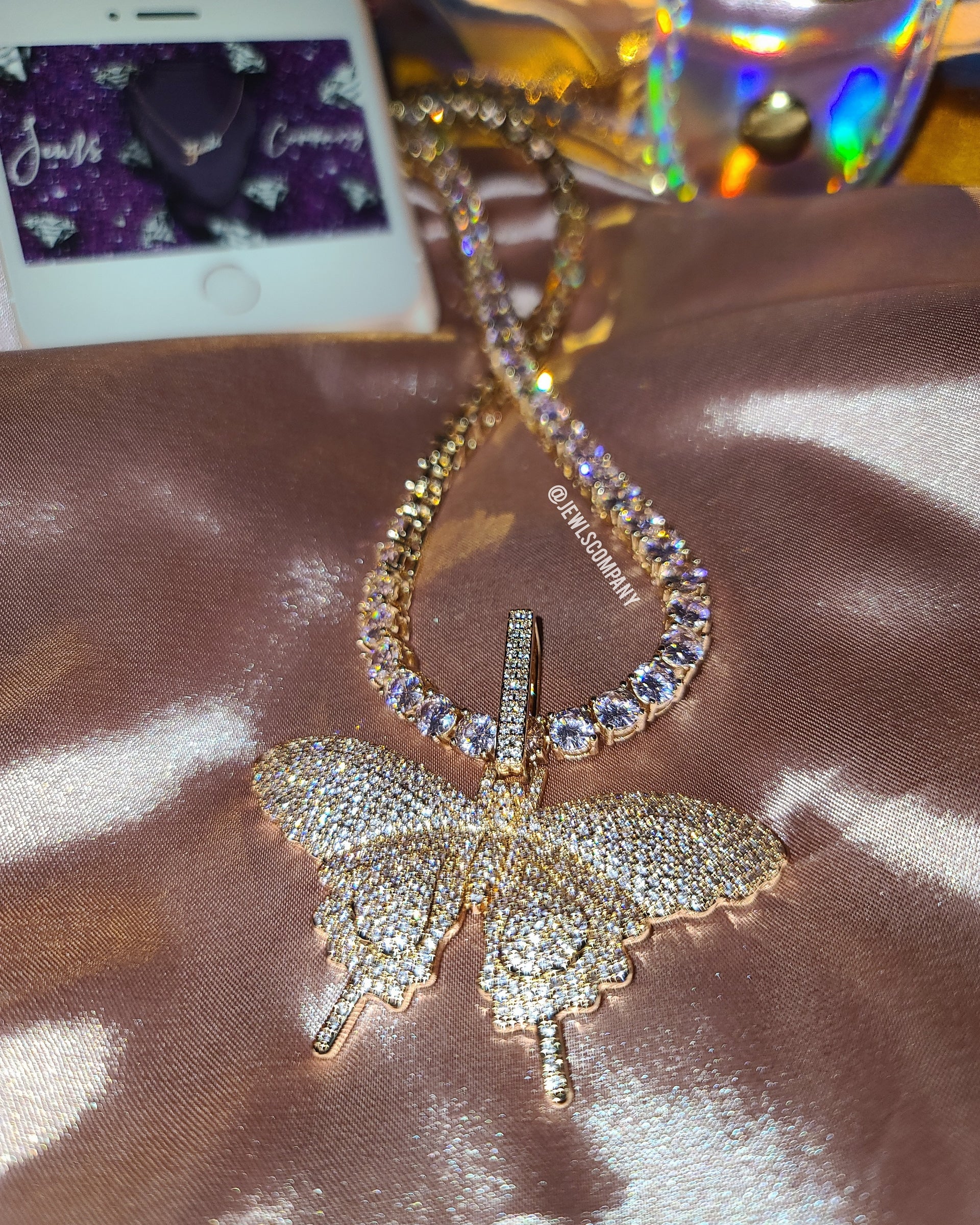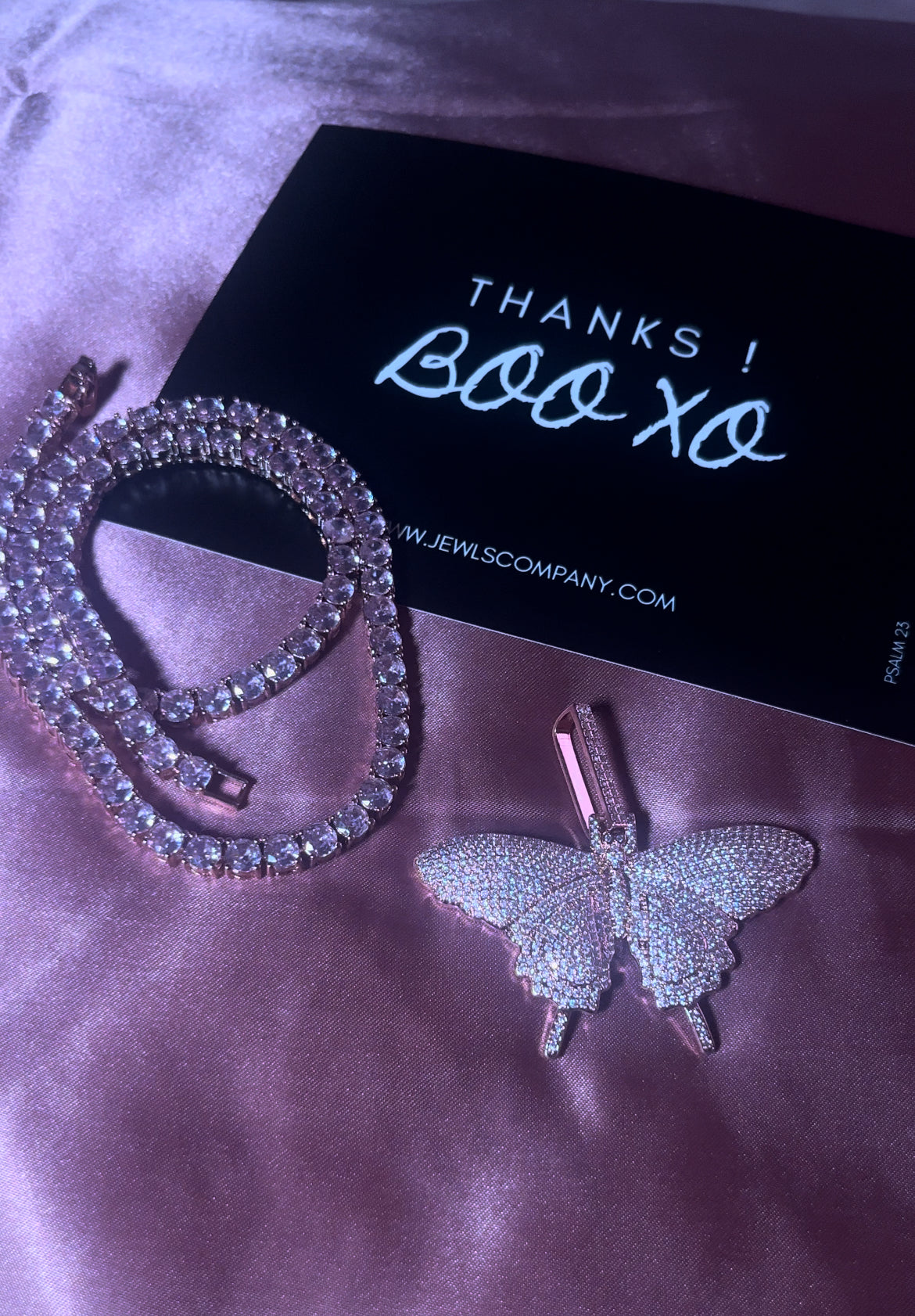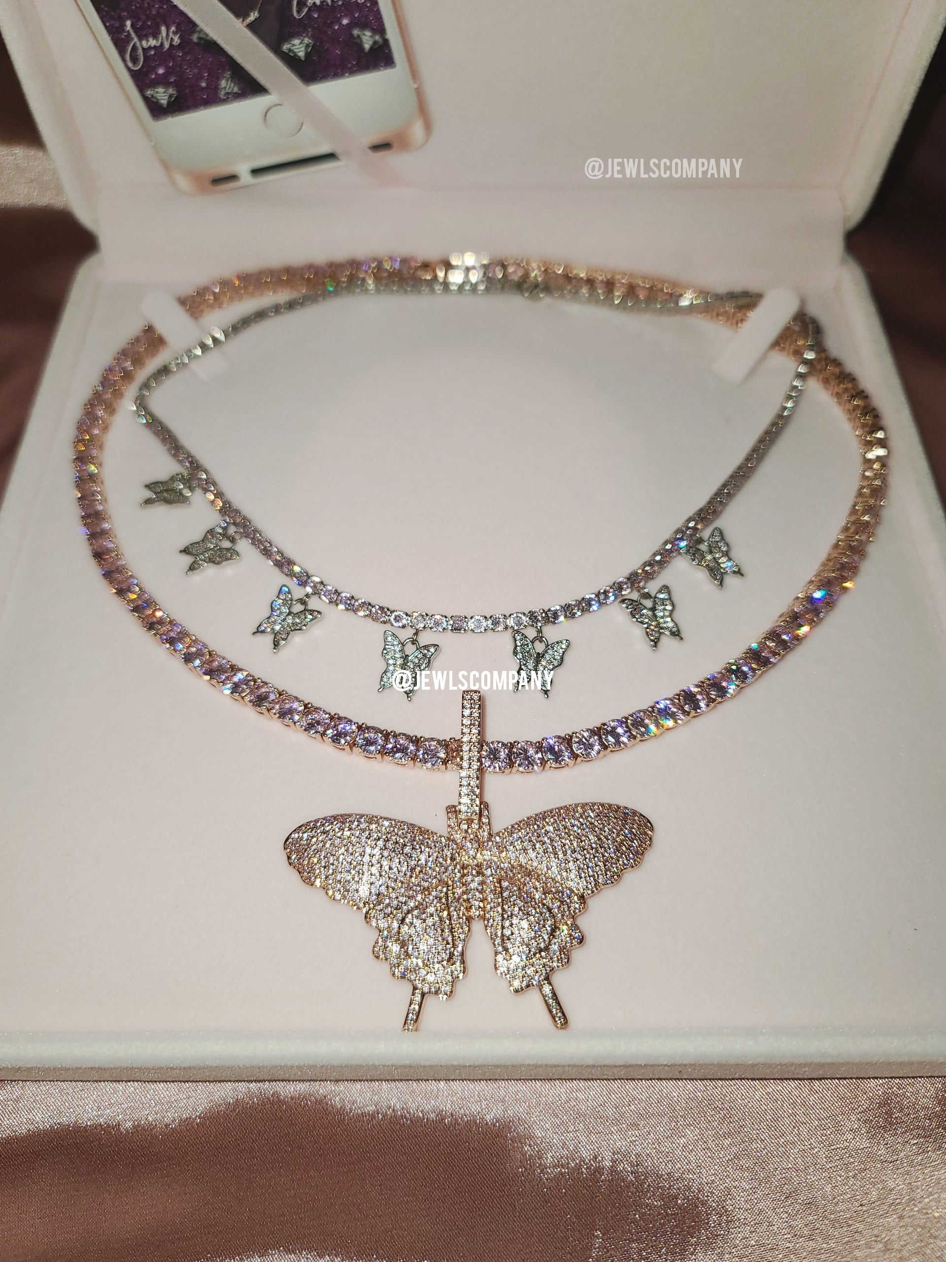 Our Butterfly Tennis Necklace comes in a pink tennis necklace with a rose gold butterfly pendant.