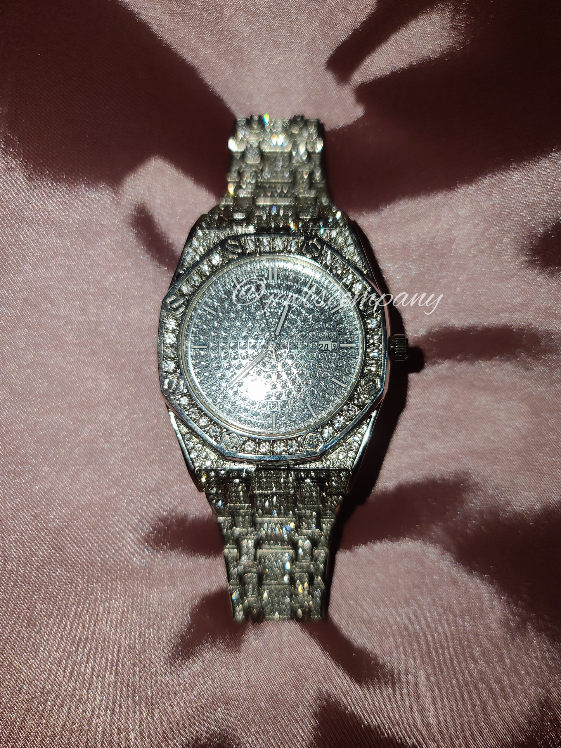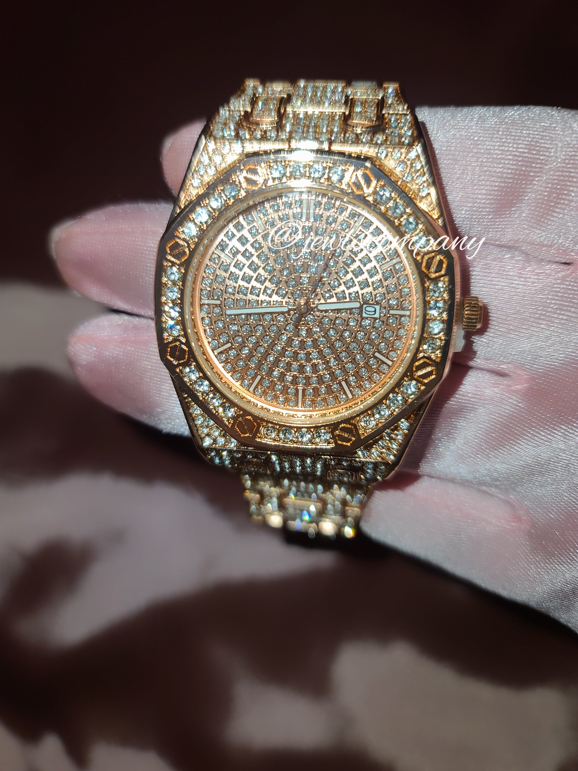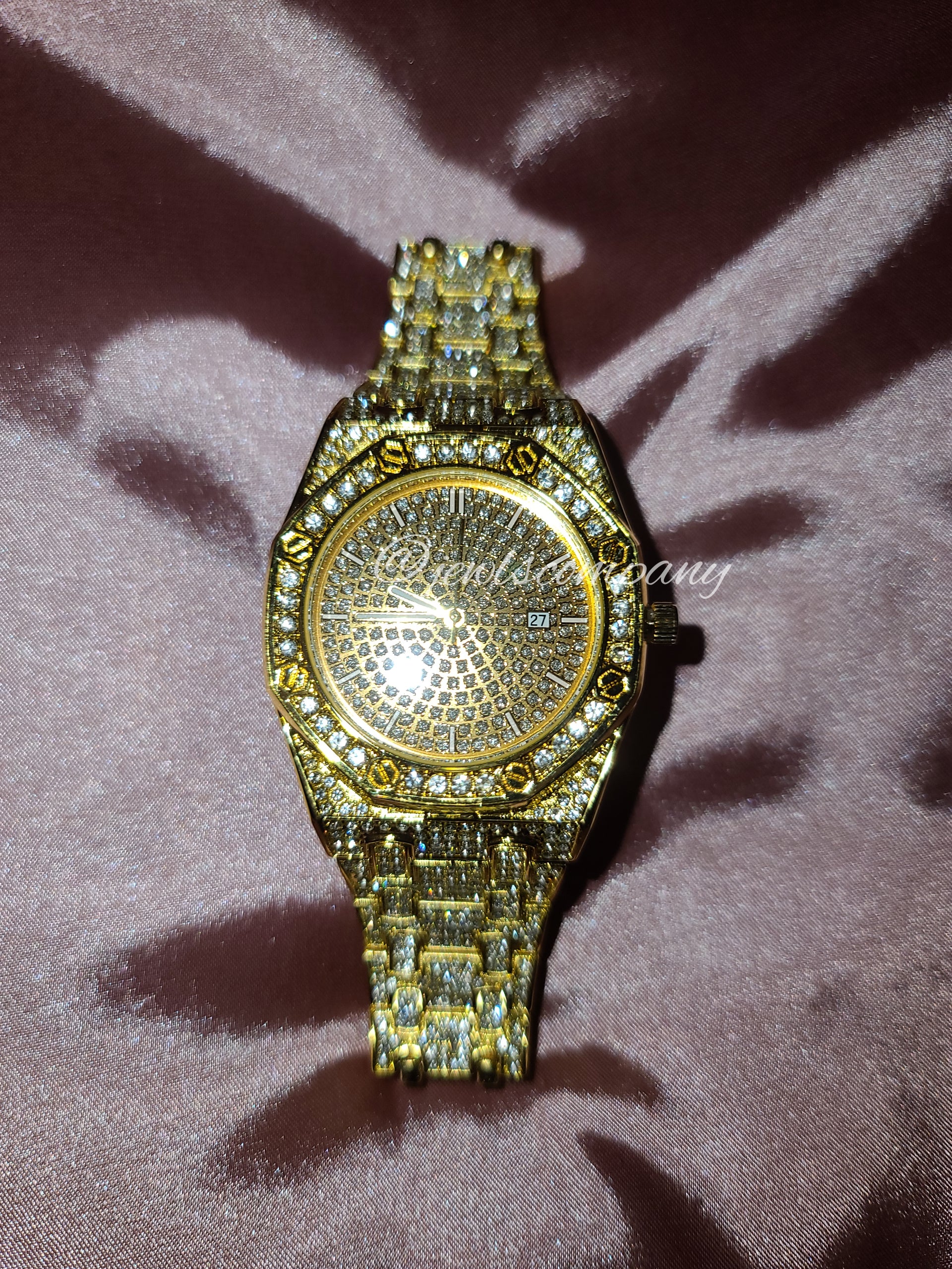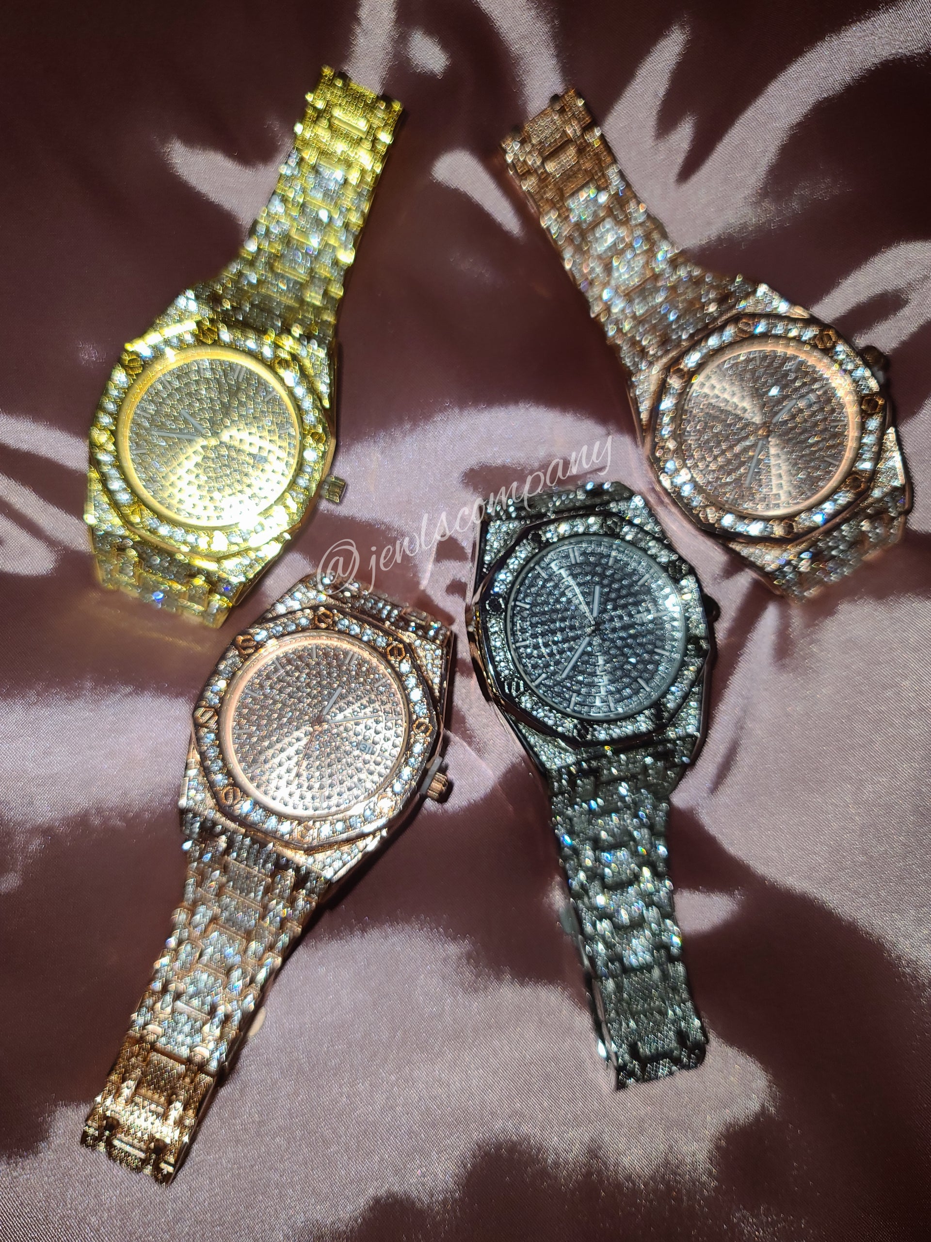 Our iced out Flossy watch is non-tarnish material & unisex fit. You can always have links sized down if needed by a local jeweler/jewelry shop. Comes in platinum finish, rose gold and gold.