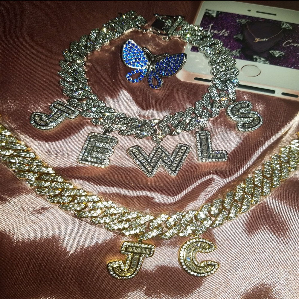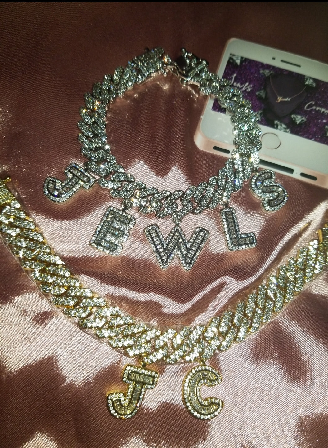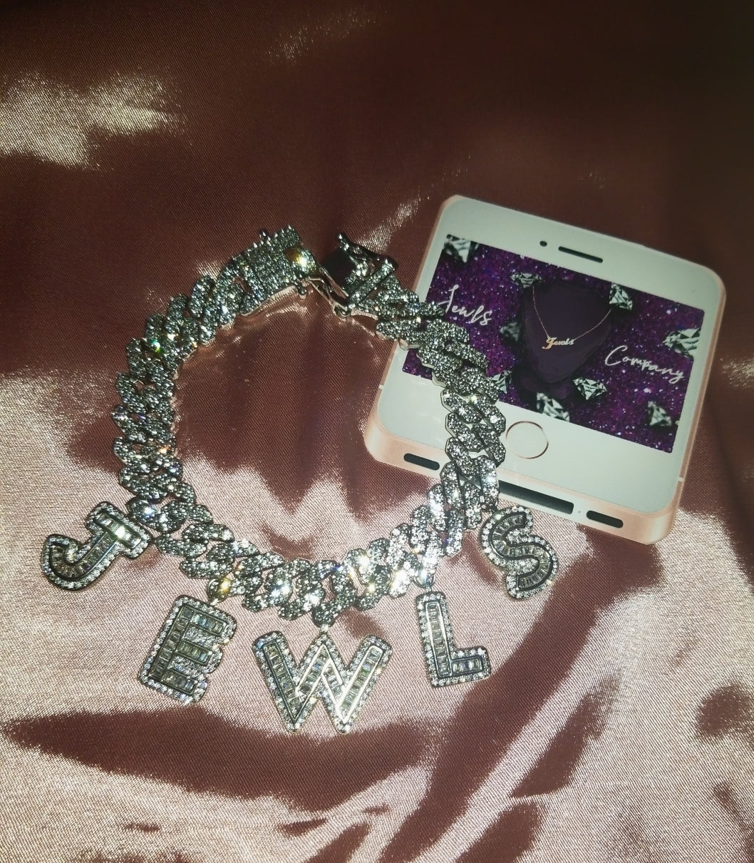 Our Icy Links bracelet in custom initials/letters, up to 8 letters. You can choose 7 inches or 8 inches sizing of wrist. If you are in between sizes choose 8 inches as you can always have links shortened if need-be. Brass material in 18k gold plated & available in Platinum plated.