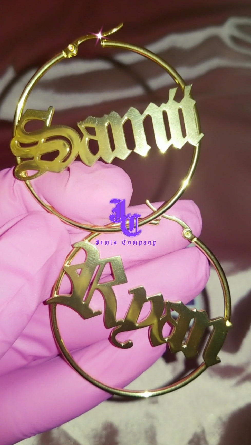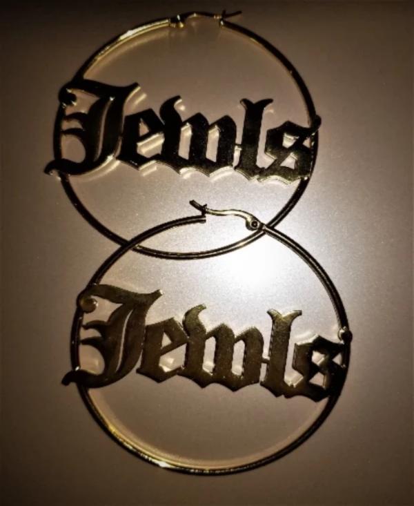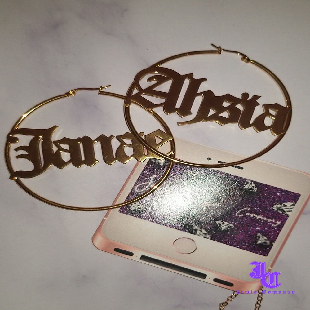 Custom made hoop earrings up to 8 letters in sizes 50 mm, 60 mm & 70 mm. Tarnish free. In your choice of Gold or Platinum plated.
